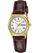Zegarek damski Casio LTP-V006GL-7B to elegancki dodatek, który łączy klasyczny design z nowoczesną funkcjonalnością. Jego subtelna, złota koperta i delikatny, skórzany pasek tworzą zgrany duet, który z łatwością dopasowuje się do różnych stylizacji – od codziennych, po te bardziej formalne. Biały cyferblat z prostymi, złotymi wskazówkami i wyraźnymi indeksami zapewnia elegancki wygląd, a jednocześnie sprawia, że zegarek jest bardzo czytelny, nawet w słabszym oświetleniu.