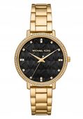 Zegarek damski Michael Kors Pyper MK4593 to kwintesencja elegancji i niezawodności, z okrągłą kopertą o średnicy 38 mm wykonaną ze stali nierdzewnej pokrytej trwałą powłoką PVD w kolorze złotym. Tarcza w odcieniu czarnym z efektem 3D, ozdobiona błyszczącymi cyrkoniami i ikonicznym logo MK, emanuje wyrafinowanym blaskiem, chroniona mineralnym szkłem o podwyższonej odporności na zarysowania, co zapewnia krystaliczną czytelność i długoletnią klarowność.