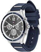 Zegarek damski Tommy Hilfiger Eve 1782281 to niebagatelny zegarek na każdą okazję. Zegarek posiada kopertę ze stali szlachetnej z powłoką w kolorze srebrnym i niebieski silikonowy pasek ze srebrnymi detalami. Na niebieskiej tarczy zabezpieczonej mineralnym i otoczonej niebieskim pierścieniem szkłem znajdziemy subtarcze wskazujące dzień miesiąca, dzień tygodnia oraz czas dobowy.