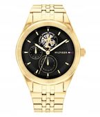 Zegarek damski Tommy Hilfiger Monica 1782717 zachwyca precyzją wykonania i ponadczasowym designem, który idealnie łączy klasyczną formę z subtelnymi, nowoczesnymi akcentami. Koperta o średnicy 38 mm z wysokiej jakości stali szlachetnej 316L w złotym odcieniu zapewnia lekkość i trwałość, podczas gdy głęboka czarna tarcza pod mineralnym szkłem podkreśla każdy detal, gwarantując niezawodny styl na lata.