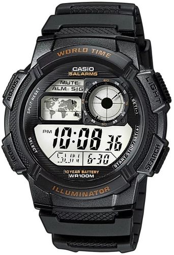 Model CASIO z Multi Time, światowym czasem, stoperem, alarmem x 5 i minutnikiem - a to wszystko 10 lat na jednej baterii. Casio AE-1000W to zegarek, który nadąża za Tobą - tarcza inspirowana kokpitem samolotu nadaje mu surowy, techniczny charakter, który podkreśla męski styl i dynamiczny tryb życia. Dzięki mapie świata i funkcji World Time możesz jednym rzutem oka sprawdzić czas w różnych strefach, co sprawia, że to idealny wybór dla podróżników i profesjonalistów pracujących na międzynarodową skalę. Wyświetlacz LC Analog sprawia, że zawsze masz pod ręką godzinę swojego miasta domowego, a wodoodporność do 100 metrów pozwala na swobodne użytkowanie zegarka w trudniejszych warunkach. To zegarek dla mężczyzn, którzy oczekują więcej – precyzji, trwałości i stylu.