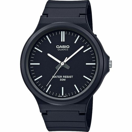 Casio MW-240-1EVEF to zegarek męski, który łączy funkcjonalność z klasycznym designem, tworząc praktyczny dodatek do codziennego użytku. Posiada czarny pasek z żywicy, trwały i lekki, zapewniający wygodę noszenia oraz dobre dopasowanie do nadgarstka, z zapięciem na klamrę gwarantującym pewne i łatwe zapięcie. Mechanizm kwarcowy zapewnia precyzyjne odmierzanie czasu przy niskim zapotrzebowaniu na konserwację, co jest typowe dla zegarków Casio stawiających na niezawodność. Czarny kolor nadaje mu stonowany i uniwersalny styl, odpowiedni na różne okazje – od pracy po spotkania nieformalne. Model ten, należący do męskiej linii Casio, jest przeznaczony dla osób szukających funkcjonalnego, trwałego zegarka o klasycznych liniach, bez zbędnych dodatków, ale z gwarancją marki znanej na całym świecie z jakości i wytrzymałości. Całość sprawia, że MW-240-1EVEF to solidna propozycja dla użytkowników ceniących prostą estetykę i skuteczność mechanizmu kwarcowego w wytrzymałym i wygodnym zegarku.