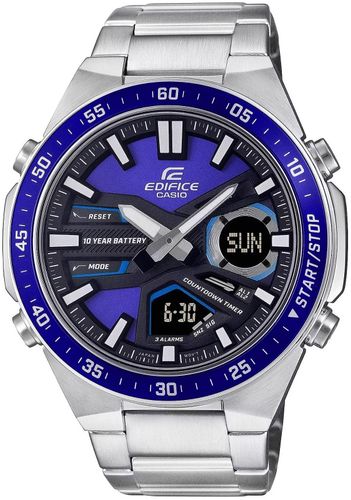 Wszechstronny zegarek dla aktywnych i wymagających. Analogowo-cyfrowy czasomierz EDIFICE EFV-C110 zapewnia precyzję i funkcjonalność na lata – 10-letnia bateria sprawia, że możesz zapomnieć o jej wymianie na długi czas. Dynamiczny, sportowy design podkreśla głębia i trójwymiarowość tarczy, a cyfrowe wyświetlacze oferują szeroki wachlarz funkcji, w tym czas światowy, stoper 1/100 sekundy i minutnik odliczający. Model posiada również Telememo z możliwością zapisania 30 numerów telefonów, zawierających do 12 cyfr z nazwą do 8 znaków. Skup się na życiu i wybierz EDIFICE EFV-C110 - zegarek, który Cię nie zawiedzie.