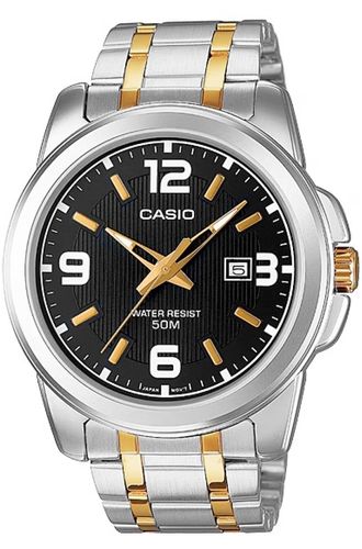 Męski model CASIO MTP-1314SG-1AVDF to idealna równowaga między elegancją a codzienną funkcjonalnością. Czarna tarcza z subtelnym żłobieniem w pionowe linie nadaje zegarkowi głębi i charakteru, a złote wskazówki i indeksy doskonale kontrastują z tłem, oferując świetną czytelność. Duże cyfry arabskie na godzinie 12, 3, 6 i 9 dodają nowoczesnego akcentu, a wbudowany datownik dyskretnie dopełnia całość. Bransoleta z połączenia stali nierdzewnej i złotych akcentów tworzy harmonijną kompozycję, która sprawdza się zarówno przy marynarce, jak i w codziennym, miejskim stylu. Koperta o klasycznych proporcjach i wodoodporność do 50M to gwarancja komfortu i trwałości w każdej sytuacji. Casio MTP – dla mężczyzny, który wie, że najlepsze połączenia to te ponadczasowe.