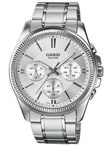 Zegarek Casio MTP-1375D 7A2VDF to model, który łączy elegancki wygląd z niezawodnymi funkcjami, idealny dla mężczyzn ceniących nowoczesny design i praktyczność. Jego elegancka tarcza w odcieniu srebrnym, subtelnie kontrastująca z wskazówkami i indeksami, nadaje mu wyrafinowanego charakteru, który doskonale pasuje do zarówno casualowych, jak i formalnych stylizacji. Dodatkowo, elegancka stalowa koperta i bransoleta sprawiają, że zegarek prezentuje się wyjątkowo, a jego wykończenie świadczy o dbałości o detale i wysoką jakość wykonania.