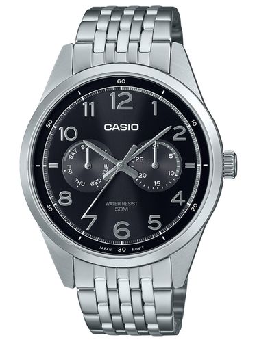 Zegarek męski CASIO MTP-E340D-1A to harmonijne połączenie klasycznej elegancji i nowoczesnej funkcjonalności, które sprawia, że ten model staje się idealnym wyborem dla mężczyzn ceniących sobie styl, niezawodność i uniwersalność. Jego okrągła, stalowa koperta w srebrnym odcieniu emanuje ponadczasowym designem, a jednocześnie prezentuje się niezwykle nowocześnie dzięki subtelnym detalom. Tarcza zegarka, utrzymana w stonowanej, czarnej kolorystyce, została ozdobiona srebrnymi indeksami oraz smukłymi wskazówkami, które zapewniają doskonałą czytelność czasu. Subtelny akcent w postaci funkcji datownika oraz chronografu dodaje zegarkowi praktycznego charakteru, czyniąc go nie tylko stylowym, ale i funkcjonalnym dodatkiem, który zawsze przypomni Ci o ważnych terminach.