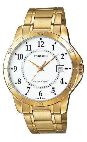 Męski model z kolekcji CASIO, wyróżniający się klasyczną 40-milimetrową kopertą oraz bransoletą ze stali nierdzewnej, pokrytymi trwałą powłoką jonową w kolorze złota. Jasna tarcza z wyraźnymi, czarnymi cyframi arabskimi zapewnia doskonałą czytelność, a dodatkowa skala minutowa w wewnętrznym pierścieniu ułatwia orientację w czasie. Praktyczny datownik zlokalizowany przy godzinie 3 umożliwia szybki wgląd w aktualny dzień miesiąca. Wodoodporność na poziomie WR (Water Resist) sprawia, że zegarek bez obaw można nosić na co dzień – np. podczas mycia rąk czy w deszczową pogodę. Zegarek napędzany jest precyzyjnym mechanizmem kwarcowym, gwarantującym niezawodne działanie.