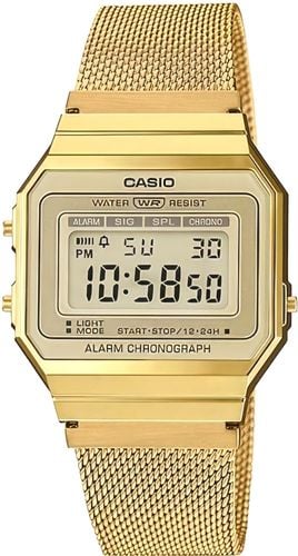 CASIO A700WMG to model to ukłon w stronę estetyki retro, zamknięty w smukłej, nowoczesnej formie. Zaledwie 6 mm grubości sprawia, że zegarek wygląda subtelnie i nosi się jak delikatna bransoletka – niezauważalny na co dzień, ale trudny do przeoczenia. Złota koperta i dopasowana stalowa bransoleta dodają mu klasy, a cyfrowy wyświetlacz dba o funkcjonalność – pokazuje godzinę, datę, dzień tygodnia i porę dnia. Gdy dzień nabiera tempa, możesz liczyć na precyzyjny stoper, codzienny alarm i odporność na zachlapania – wszystko, czego potrzebujesz w codziennej bieganinie. A wieczorem? Podświetlenie LED w ciepłym, bursztynowym odcieniu podkreśla klimat vintage i ułatwia odczyt godziny, nawet przy zgaszonym świetle. To zegarek, który pasuje do każdej chwili – elegancki, funkcjonalny i zawsze na czasie.