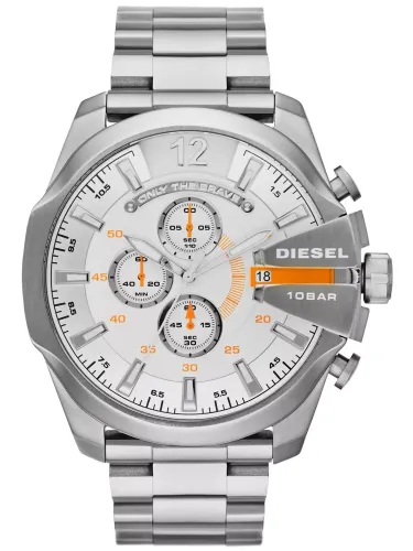 Zegarek męski Diesel DZ4328 to model, który łączy elegancję z nowoczesnym, odważnym designem. Jego imponująca koperta o szerokości 51 mm i grubości 14 mm wykonana z wysokiej jakości stali szlachetnej nadaje zegarkowi solidny i masywny charakter, który doskonale przyciąga wzrok. Srebrna tarcza z subtelnym logo Diesel, w połączeniu z wyraźnymi indeksami i dużymi wskazówkami, tworzy elegancką całość, idealną zarówno na formalne, jak i codzienne okazje.