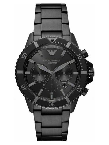 Męski zegarek Emporio Armani AR11363 Diver to elegancki męski zegarek, który został przygotowany z myślą o wszystkich miłośnikach mody i najnowszych stylistycznych trendów. Bransoleta oraz koperta wykonane zostały ze stali szlachetnej w kolorze czarnym. Ten model zegarka czaruje unikatowym, bardzo charakterystycznym designem ponieważ każdy z elementów jest tu przemyślany i ściśle związany z aspektem funkcjonalnym. Jeśli szukasz zegarka na długie lata, to wybór tego modelu o czarnej tarczy będzie strzałem w dziesiątkę Na tarczy zabezpieczonej mineralnym szkłem znajdziemy datownik wskazujący dzień miesiąca oraz subtarcze będące wskazaniami chronografu oraz czasu dobowego.