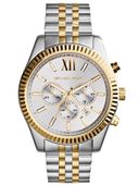Model Michael Kors MK8344 to elegancki męski zegarek na bransolecie w kolorze srebrnym i złotym wykonanej ze stali szlachetnej. Wyposażony jest w precyzyjny mechanizm kwarcowy, dzięki któremu zegarek dokładanie pokazuje aktualną godzinę. Dostępne funkcje to chronograf, datownik dnia miesiąca oraz 24-godzinne wskazanie czasu. Tarczę ochrania mineralne, odporne na zarysowania szkiełko.