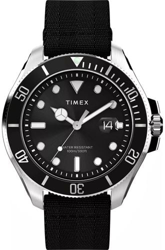 Męski Model TIMEX Harborside Coast inspirowany estetyką żeglarską, wyróżnia się eleganckim, ale zarazem zdecydowanym charakterem. Wytrzymała koperta o średnicy 43 mm z efektownym, pionowym szczotkowaniem oraz głęboka, czarna tarcza z subtelnym połyskiem przyciągają wzrok i dodają całości klasy. Centralnym punktem jest datownik z wypukłym szkłem powiększającym – detal, który dodaje zegarkowi klasy i nawiązuje do najlepszych wzorców w świecie czasomierzy. Zegarek wyposażony jest w pasek #tide™ wykonany z przetworzonego plastiku wyłowionego z oceanu, z szybkozłączkami umożliwiającymi łatwą wymianę. Harborside Coast posiada wodoszczelność do 100 metrów, obrotowy bezel oraz solidną osłonę koronki, co czyni go idealnym towarzyszem zarówno na wodzie, jak i na lądzie.