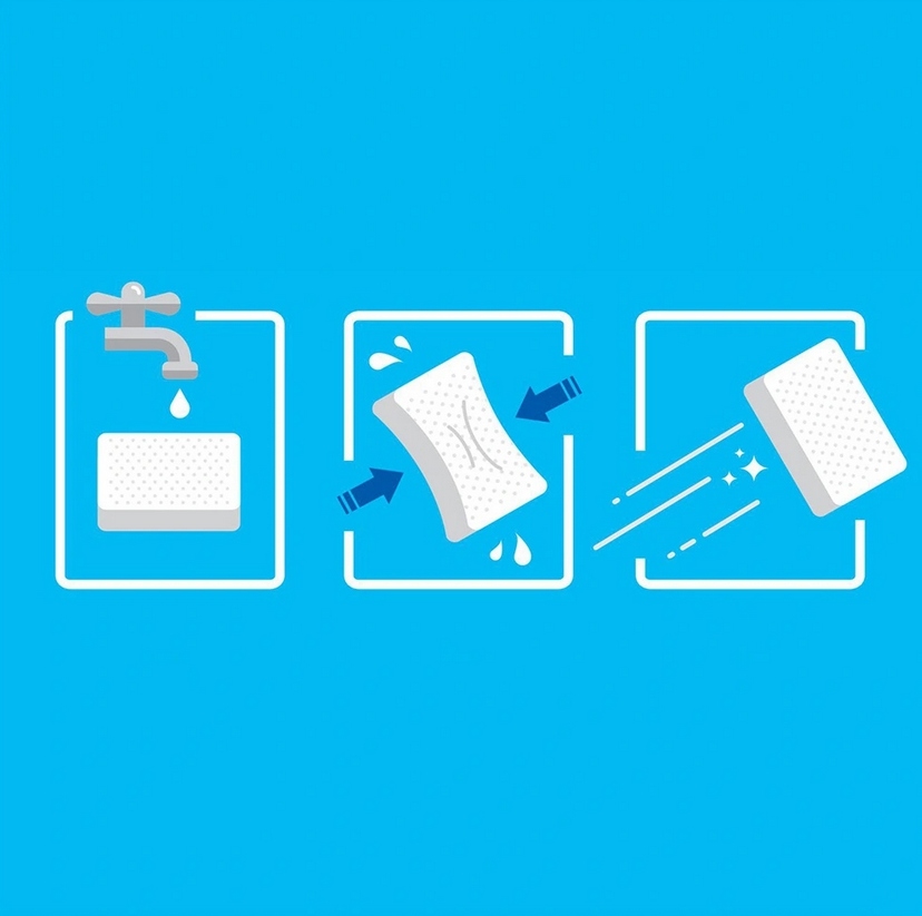 ✧Aby szybko wyczyścić zabrudzenia, gąbkę wystarczy namoczyć niewielką ilością wody - bez środków chemicznych. Następnie należy odcisnąć nadmiar wody i wyszorować wybraną powierzchnię.