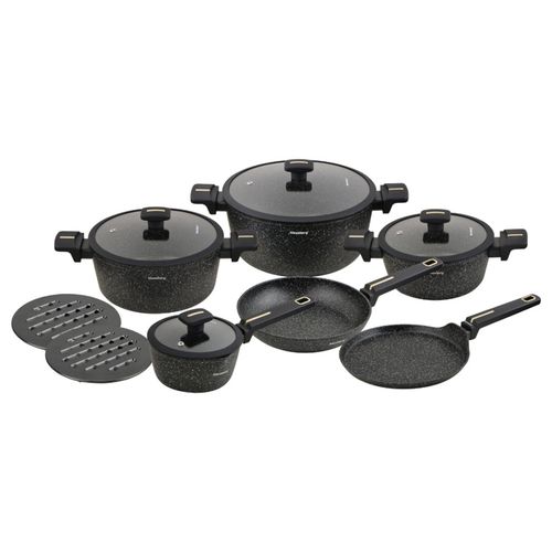 Gotuj wygodniej, zdrowiej i z klasą. Zestaw Klausberg KB-7966 to 12-elementowy komplet garnków i patelni wykonanych z odlewanego aluminium z marmurkową powłoką nieprzywierającą, która zapewnia równomierne smażenie i łatwe czyszczenie. Grube ferromagnetyczne dno gwarantuje szybkie nagrzewanie i pełną kompatybilność z płytami indukcyjnymi, a uchwyty soft-touch pozostają chłodne i zapewniają pewny chwyt.