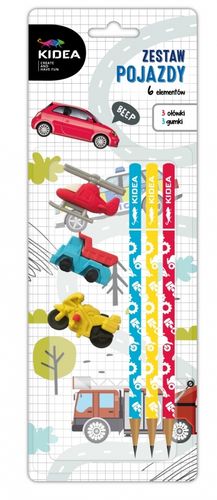 Zestaw 3 ołówków i 3 gumek z kolorowym nadrukiem - wzór: pojazdy.