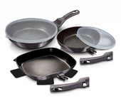Naczynia z serii CARBON PRO firmy BERLINGER HAUS wykonane są z wysokiej klasy odlewanego aluminium pokrytego wewnątrz potrójną powłoką granitową (marble) o bardzo wysokim współczynniku twardości. Powłoka zewnętrzna w kolorze metalicznym grafitowym. Te atrakcyjne i modne naczynia wyposażone są standardowo w uchwyty typu SOFT TOUCH (silikon handle). Przystosowane do wszystkich rodzajów kuchenek: gazowa, elektryczna, ceramiczna, halogenowa, indukcyjna. System TURBO INDUCTION (bardzo szybko nagrzewają się) pozwala zaoszczędzić nawet 35% energii.