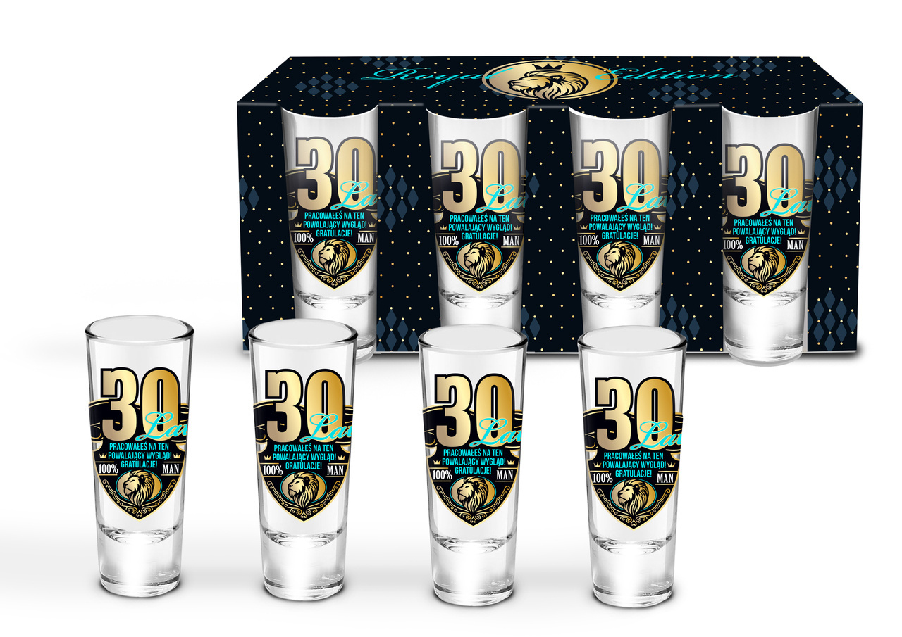 Kieliszki z napisem "30 Lat pracowałeś na ten powalający wygląd! Gratulacje! 100% Man".