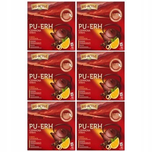 Ten wyjątkowy zestaw 6 herbat czerwonych Pu-Erh z cytryną Big Active zawiera aż 240 torebek najwyższej jakości herbaty czerwonej pochodzącej bezpośrednio z Chin. Wzbogacona naturalną skórką cytryny (5%) i aromatami naturalnymi, tworzy harmonijną kompozycję smakową, która idealnie pobudza metabolizm i wspiera zdrowy styl życia.
