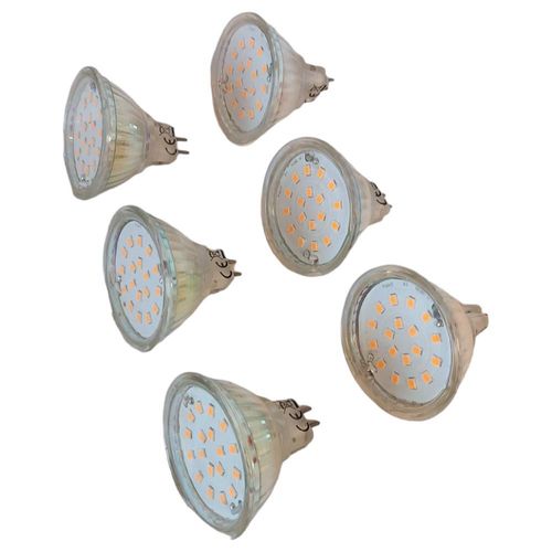 Zestaw 6 żarówek LED MR16 GU5.3. 6-częściowy zestaw żarówek LED MR16 GU5.3, ciepła biel, 5 W, 450 lm, zamiennik do lamp halogenowych 45 W, kąt świecenia 120°, CRI 82 12 V AC/DC, reflektor LED z gwintem GU5.3. Energooszczędna żarówka LED MR16/GU5.3 o mocy 45 W zużywa tylko 5 W i oszczędza 90% energii, mniej niż tradycyjne lampy halogenowe. Ciepłe światło i wysoki współczynnik CRI 82Ra. Światło o wyższym współczynniku oddawania barw 82Ra sprawia, że kolory oświetlonych przedmiotów wyglądają nie szaro, lecz naturalnie i zapewniają ciepłą i przytulną atmosferę. Szeroki kąt świecenia 120°: Posiadają kąt świecenia 120° i dlatego nadaje się w szczególności do stosowania w pomieszczeniach mieszkalnych, sypialni, witrynach sklepowych i biurach. Brak możliwości ściemniania: Nie należy używać tych żarówek z przełącznikiem ściemniania, ponieważ ściemniacz może migać lub powodować szumy. Bez migotania: Niemigoczące światło i brak ostrych oślepiania zapobiegają zmęczeniu oczu i zapewniają przyjemną i bezstresową atmosferę. Żywotność 30000 godzin. Specyfikacja:. Marka: Allesgute Ilość: 6szt Wymiary: śr. 50 x wys. 45 mm Typ lampy: LED Barwa światła: 3000 K Stopień ochrony: IP20 Gwint: GU5.3 / MR16 Znamionowy pobór mocy: 5 W Napięcie robocze: 12 V AC/DC Znamionowy kąt promieniowania: 120° Możliwość przyciemniania: nie Wartość porównawcza: ok. Lampy halogenowe 45 W Klasa efektywności energetycznej: G. Zestaw 6 żarówek LED MR16 GU5.3