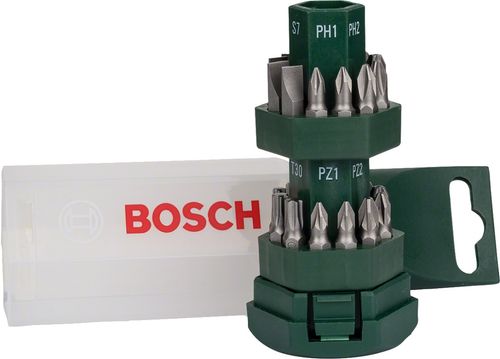 24 końcówki wkręcające, L = 25 mm PH 1/1/2/2/3/3 PZ 1/1/2/2/3/3 S 4/4/6/6/7/7 T 20/20/25/25/30/30 1 uchwyt uniwersalny, magnetyczny Zawartość displaya: 20 x 2 607 019 503