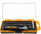 Zestaw został zaprojektowany z myślą o Twoim komforcie i wygodzie pracy. Znajdują się w nim takie akcesoria jak przedłużka, adapter i grzechotka, które ułatwiają manewrowanie narzędziami w trudno dostępnych miejscach, zapewniając skuteczną i wydajną pracę.