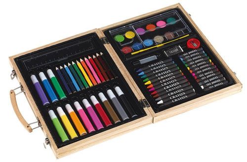 Zestaw do kolorowania GAUDY, 12 kolorowych kredek, 12 flamastrów, 12 kredek świecowych, 12 olejnych kredek pastelowych, 12 farb akwarelowych, 1 pędzel, 1 ołówek,