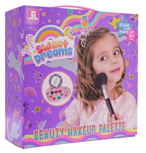 Wymiary | - szkatułka z kosmetykami, złożona ok. 5,5 cm x 12 cm średnicy, rozłożona ok. 13 cm x 20 cm, - dwustronne patyczki do cieni do powiek i pomadek ok. 4 cm długości, - mniejsze serduszka z cieniami do powiek i pomadkami do ust ok. 2,5 cm x 2,5 cm, - większe serduszka z cieniami do powiek i pomadkami do ust ok. 3,5 cm x 3,5 cm, - gwiazdki z pomadkami do ust z brokatem ok. 2,5 cm x 2,5 cm, - lusterko ok. 7,5 cm średnicy, - opakowanie ok. 19,5 cm x 19 cm x 8 cm. |