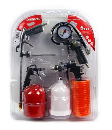 Zestaw pneumatycznych narzędzi lakierniczych do malowania, lakierowania, przedmuchiwania, ropowania i pompowania.