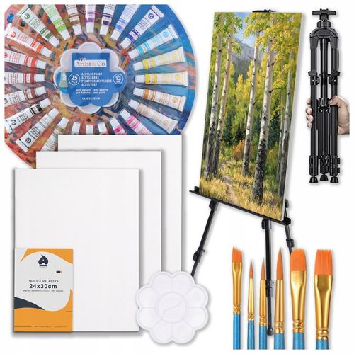 ✔️**KOMPLETNY PROFESJONALNY ZESTAW** - Zawiera wszystkie niezbędne elementy: sztalugę aluminiową, 24 farby akrylowe, 3 gruntowane płótna, 6 pędzli oraz paletę malarską w jednym zestawie.