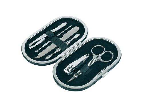 Elegancki zestaw do manicure DENISE zawiera nożyczki, pilniczek, pincetę, obcinacz, 2 patyczki do manicure, zapakowany w owalne pudełko otwierane przyciskiem.