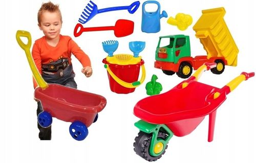 Wyposażony w dużą, polską taczkę o żywej kolorystyce, sprzyja zabawie na zewnątrz i pomaga w rozwijaniu wyobraźni dziecka. Zestaw zabawek do piaskownicy jest kompletny, zawiera wszystko, czego dzieci potrzebują do budowy zamków z piasku, ogrodów i innych projektów.