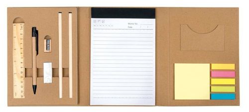 Zestaw do pisania SCHOOL DAYS w tym tekturowy długopis (niebieski wkład), linijka (15 cm), drewniana temperówka, gumka, dwa drewniane ołówki, 1 notatnik w