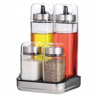 Zestaw butelek dozowników do oliwy i octu oraz pieprzniczka i solniczka.