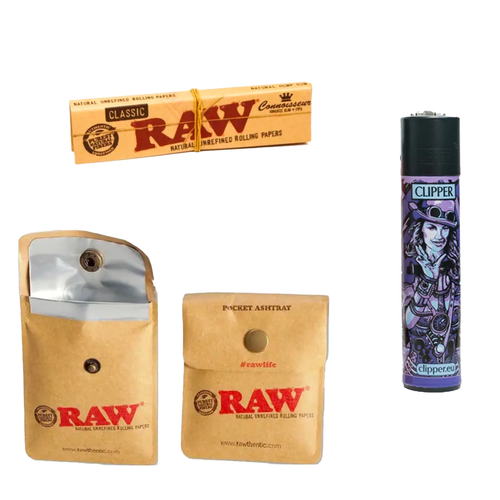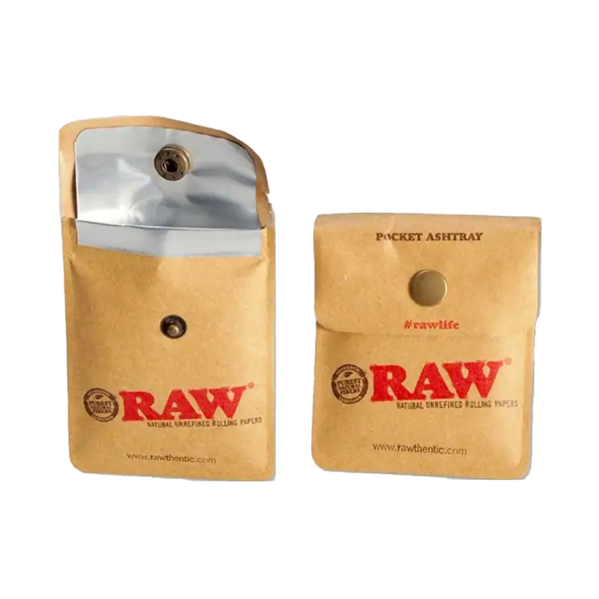 Zestaw zawiera popielniczkę kieszonkową RAW Pocket. Jest ona wykonana z tworzywa o fakturze przypominającej papier, co dodaje jej naturalnego wyglądu. Jej poręczny rozmiar sprawia, że łatwo zmieści się w kieszeni, a wytrzymały materiał i łatwość czyszczenia gwarantują jej długotrwałe użytkowanie. Dzięki niej zawsze będziesz miał gdzie bezpiecznie i higienicznie pozbyć się niedopałków.