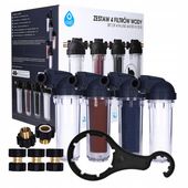 Zestaw gwarantuje pełną niezawodność w różnych warunkach, umożliwiając montaż pionowy lub poziomy, pojedynczo lub w konfiguracjach. Dzięki śrubunkom, złączkom i kluczowi montażowemu, instalacja jest prosta i trwała, chroniąc przed wtórnymi zanieczyszczeniami z sieci wodociągowej. To rozwiązanie, które utrzymuje stałą jakość wody, niezależnie od warunków hydraulicznych w domu czy mieszkaniu.