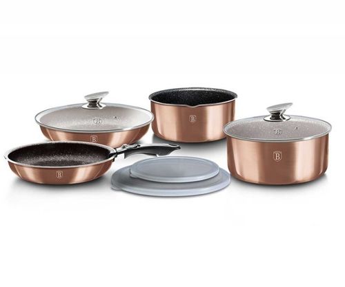 Najwyższej jakości zestaw garnków i patelni aluminiowych z unikalną powłoką granitową oraz odpinaną rączką w systemie Click it. Produkt renomowanej marki BERLINGERHAUS z linii Rose Gold. Przystosowane do wszelkiego typu kuchenek, także indukcyjnych.