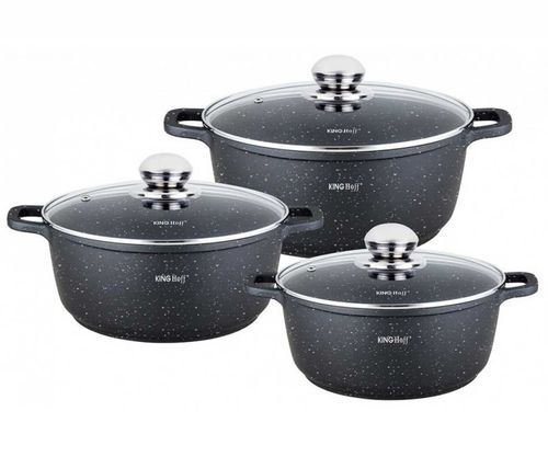 Zestaw odlewanych garnków żaroodpornych z powłoką marmurkową, umożliwiającą zdrowe gotowanie.
