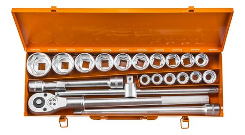 Zestaw kluczy nasadowych 3/4" NEO składa się z 21 elementów wykonanych z wysokiej jakości stali chromowo-wanadowej. W skład zestawu wchodzi grzechotka 500 mm, wyposażona w trwały mechanizm zapadkowy (24 zęby).