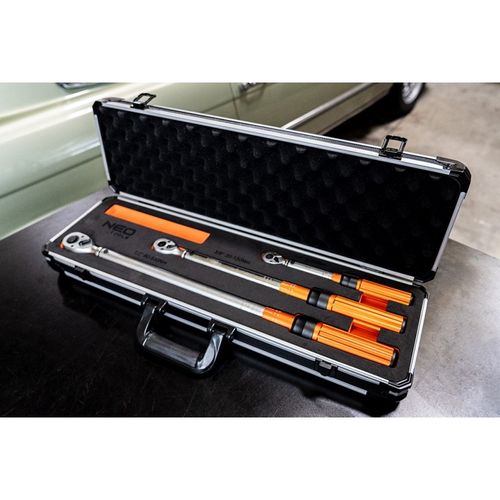 Zestaw kluczy dynamometrycznych dwukierunkowych 1/4", 3/8", 1/2" 3 szt. 08-845 marki NEO to zestaw profesjonalnych trzech kluczy, niezbędnych w serwisie motoryzacyjnym. Składa się na narzędzia o zakresie działania: 1/4" 5-25 Nm 3/8" 20-120 Nm 1/2" 60-330 Nm, oraz dokładności +/- 3% w prawo i +/- 6% w lewo.