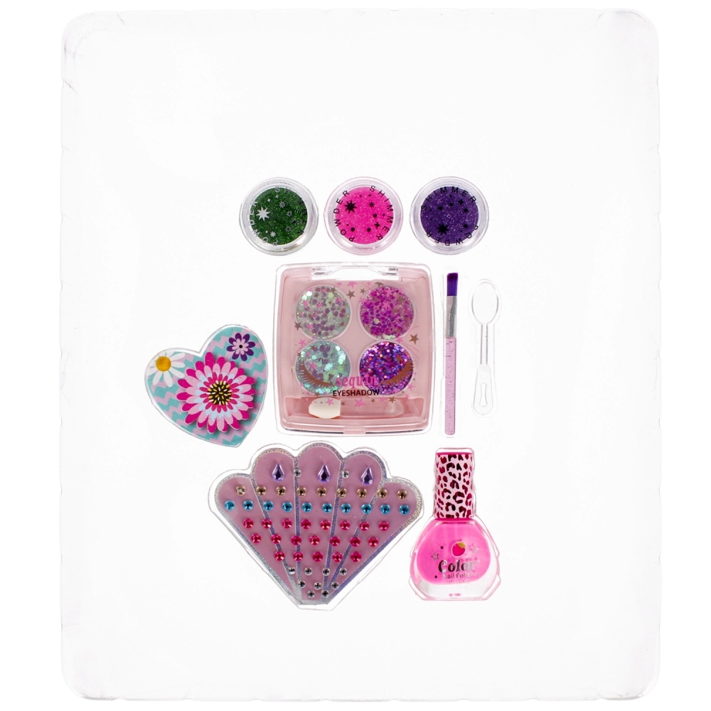 Zestaw zawiera brokatowe cienie do powiek, kryształki, lakier do paznokci, pędzelek, łyżeczkę do brokatu i 3 kolory pyłków. Wspiera rozwój kreatywności, dokładności i sprawi, że każda dziewczynka poczuje się jak dama.