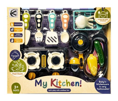 W skład zestawu wchodzą plastikowe przybory kuchenne oraz produkty, będące imitacjami wyposażenia prawdziwej kuchni. Produkt wykonany jest z wysokiej jakości plastiku, zapewnia długie użytkowanie. Zabawka idealnie nada się na prezent dla małego kucharza i zapewni wiele godzin wspaniałej zabawy.