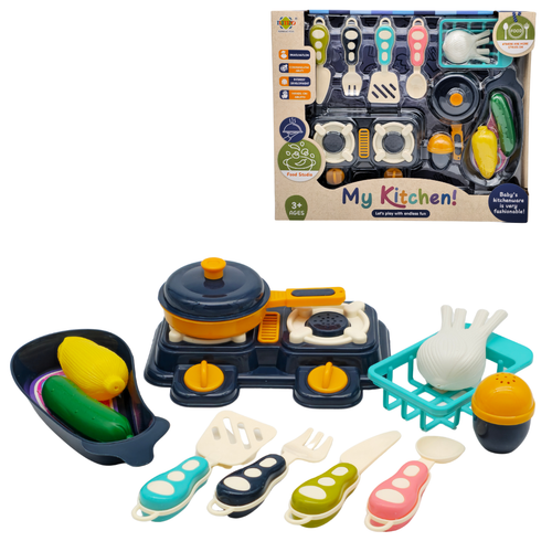 W skład zestawu wchodzą plastikowe przybory kuchenne oraz produkty, będące imitacjami wyposażenia prawdziwej kuchni. Produkt wykonany jest z wysokiej jakości plastiku, zapewnia długie użytkowanie. Zabawka idealnie nada się na prezent dla małego kucharza i zapewni wiele godzin wspaniałej zabawy.