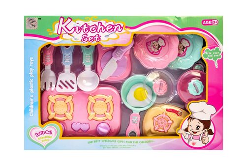 W skład zestawu wchodzą plastikowe przybory kuchenne oraz produkty, będące imitacjami wyposażenia prawdziwej kuchni. Produkt wykonany jest z wysokiej jakości plastiku, zapewnia długie użytkowanie. Zabawka idealnie nada się na prezent dla małego kucharza i zapewni wiele godzin wspaniałej zabawy.