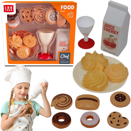 Zestaw zawiera bogaty asortyment słodkich akcesoriów, w tym różnorodne ciastka, pączki, croissanty i inne wypieki wykonane z wysokiej jakości materiałów. W zestawie znajdziemy również szklankę z czerwoną podstawą oraz karton soku wiśniowego "Juice Cherry", co sprawia, że zabawa staje się jeszcze bardziej realistyczna. Wszystkie elementy zostały starannie zaprojektowane, aby przypominać prawdziwe produkty cukiernicze. Zabawka rozwija kreatywność, umiejętności społeczne podczas zabawy w sklep czy restaurację, oraz pomaga w nauce rozpoznawania różnych rodzajów żywności. Zestaw jest bezpieczny dla dzieci i wykonany z trwałych materiałów.