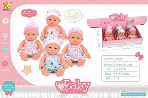 Każda lalka ma wysokość 30 cm i jest wykonana z bezpiecznych, miękkich materiałów. Laleczki ubrane są w kolorowe body z uroczymi wzorami - serduszka, gwiazdki i inne delikatne motywy. Każda posiada śliczną czapeczkę dopasowaną kolorystycznie do stroju. Lalki mają realistyczne rysy twarzy z delikatnymi rumieńcami, co czyni je jeszcze bardziej urokliwymi. Zabawka rozwija umiejętności społeczne, empatię i wyobraźnię dziecka poprzez zabawę w opiekowanie się lalką. Wysokiej jakości wykonanie gwarantuje długotrwałą zabawę.