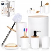 ✅ Elementy zestawu: dozownik mydła, kosz na śmieci, kubek łazienkowy, kubek na szczoteczki, mydelniczka, szczotka do WC