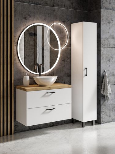 Praktyczność: Zestaw posiada dwie pojemne szuflady z cichym domykiem, idealne do przechowywania akcesoriów łazienkowych. Pierwsza szuflada została zaprojektowana z miejscem na syfon.