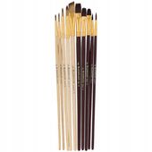 Ergonomiczna paleta malarska z 10 komorami i otworem na kciuk oraz różnorodność pędzli (okrągłe, płaskie, filbert, skośne) w rozmiarach od 6 do 18 pozwalają na precyzyjną pracę z każdą techniką malarską. Drewniane rączki z pozłacanymi okuciami zapewniają komfortowy chwyt podczas długich sesji twórczych.