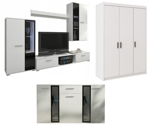 Jest to elegancka i funkcjonalna zarazem Pojemna Meblościanka wraz z Komodą oraz Ławą Idealnie Prezentuje się w każdym salonie i pokoju dzienny.