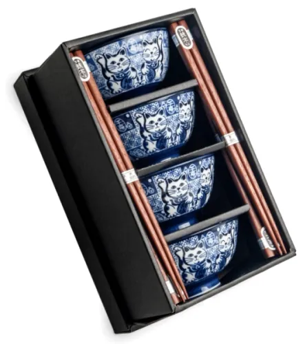 Elegancki i praktyczny zestaw do potraw azjatyckich. W komplecie 4 ceramiczne miseczki do zup i dań z ryżu oraz 4 pary pałeczek wykonanych z ciemnego drewna.